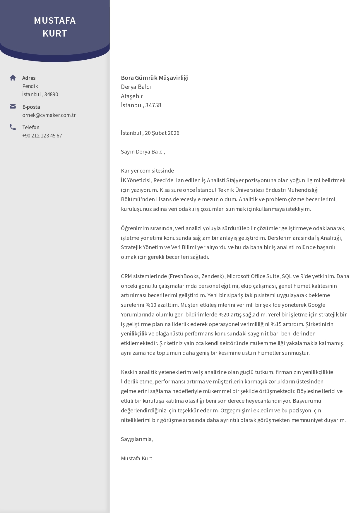 4. Veri Analisti İçin Staj Ön Yazı Gövde Örneği