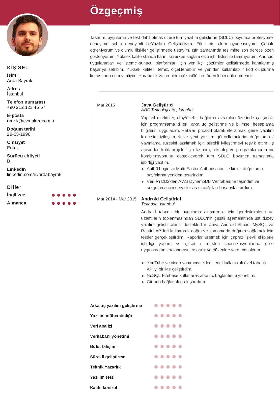 Aşağıdaki CV örneği sitemizde bulunan özgeçmiş oluşturma aracı ile hazırlanmıştır. Bu CV örneği bilgisayar becerileri ve bilgilerini nasıl listeyeceğiniz konusunda size ilham verecek ve ışık tutacaktır.