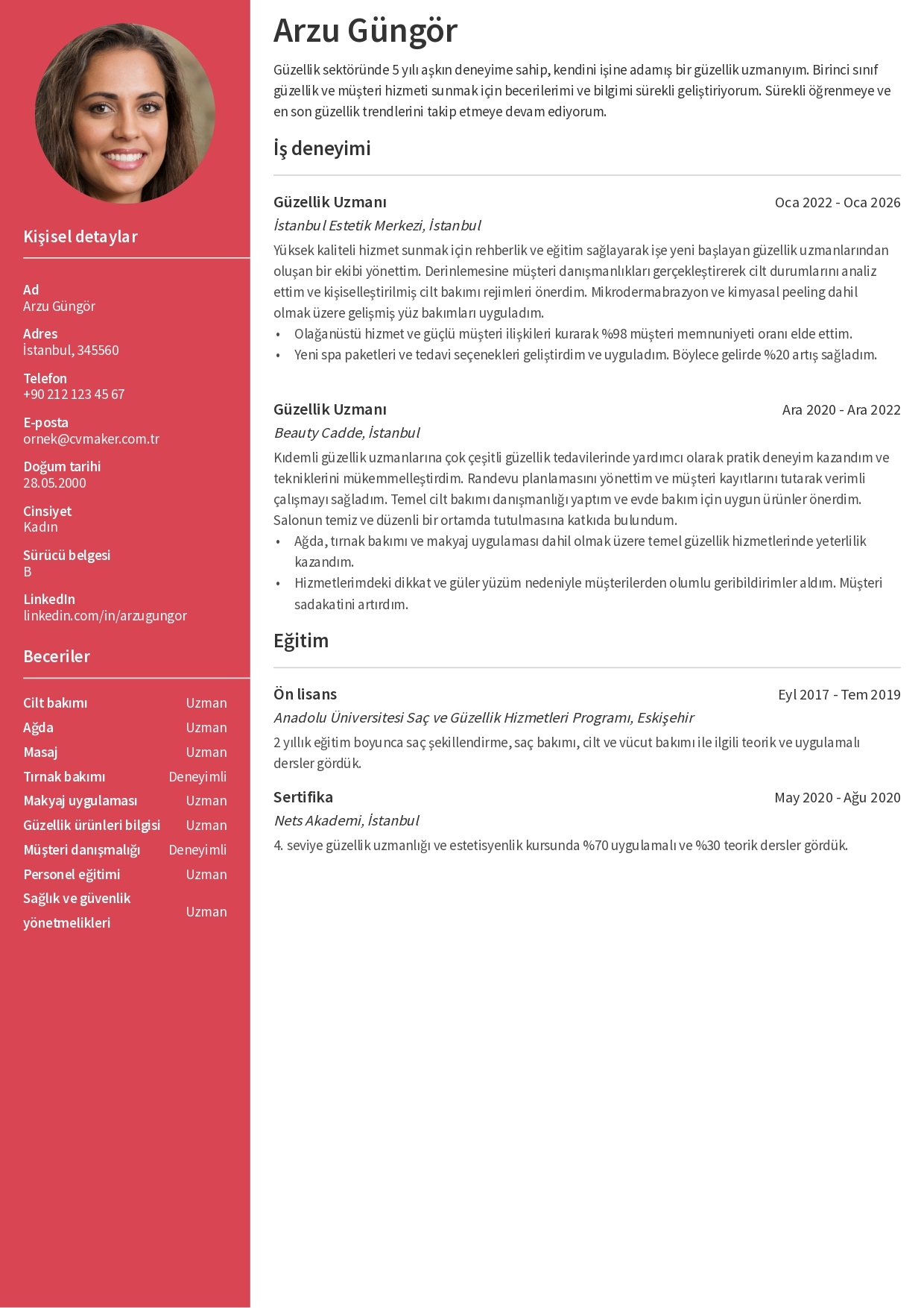 Aşağıdaki güzellik uzmanı özgeçmiş örneği deneyimli bir güzellik uzmanı olan Arzu Güngör’ün sektördeki zengin uzmanlık birikimini yansıtıyor. Güzellik sektörüne yönelik bu özgeçmiş, işverenlere gerekli bölümleri sunan, iyi yapılandırılmış, ATS uyumlu ve profesyonel bir format olan Stanford CV şablonu kullanılarak hazırlanmıştır.