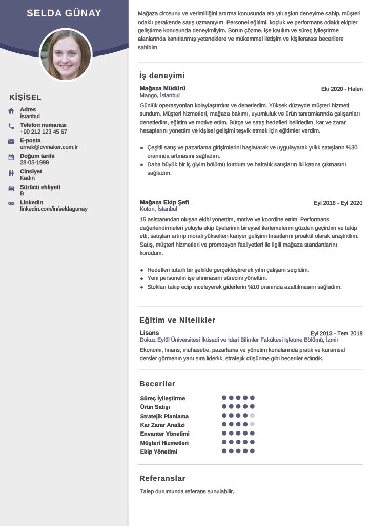 Bu perakende CV şablonunda, adayımız müşteri odaklı bir pozisyonda altı yılı aşkın deneyime sahiptir. Uzmanlığını vurgulamakta ve Mağaza Müdürü ve Takım Lideri olarak üst düzey pozisyonlara ulaşmadaki başarısını ortaya koymaktadır. Bu CV, ayrıca adayımızın n becerilerini ve deneyimlerini sergilemeye yardımcı olan profesyonel bir stil ve tasarıma sahiptir.