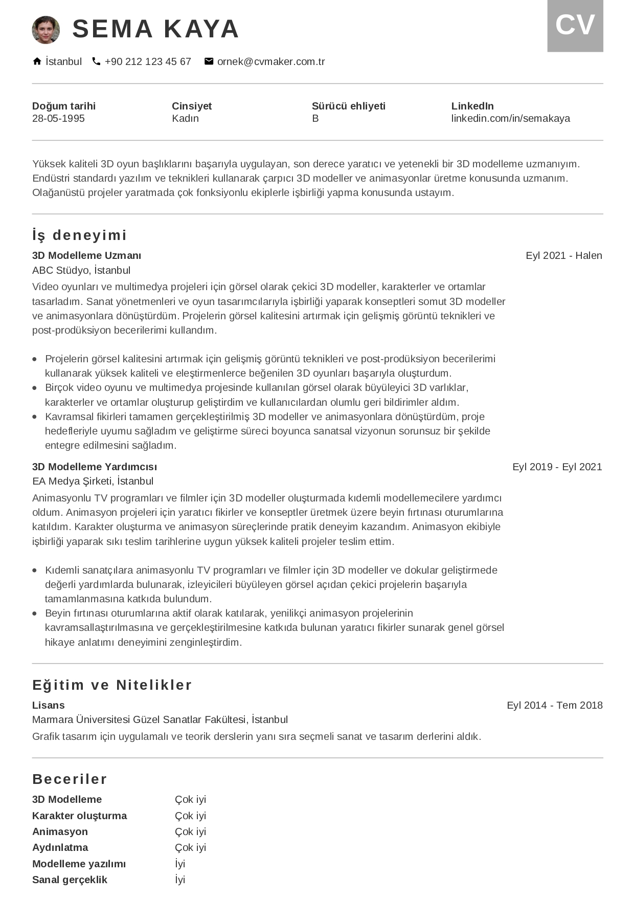 2- Deneyimsiz 3D Modelleyici Profil Özeti Örneği