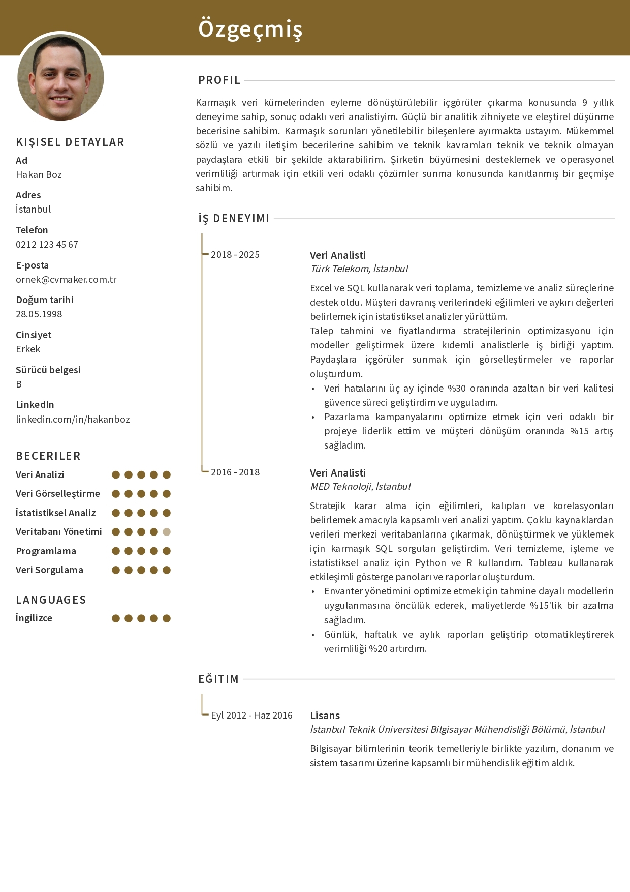 Aşağıdaki Veri Analisti CV örneği, CVMaker sitemizde bulunan Cambridge şablonu ile kahverenk kullanılarak hazırlanmıştır. Bu CV’de Hakan’ın yaklaşık 9 yıllık iş tecrübesi, sektörle ilgili teknik beceri ve aldığı eğitim başarıyla vurgulanmıştır.